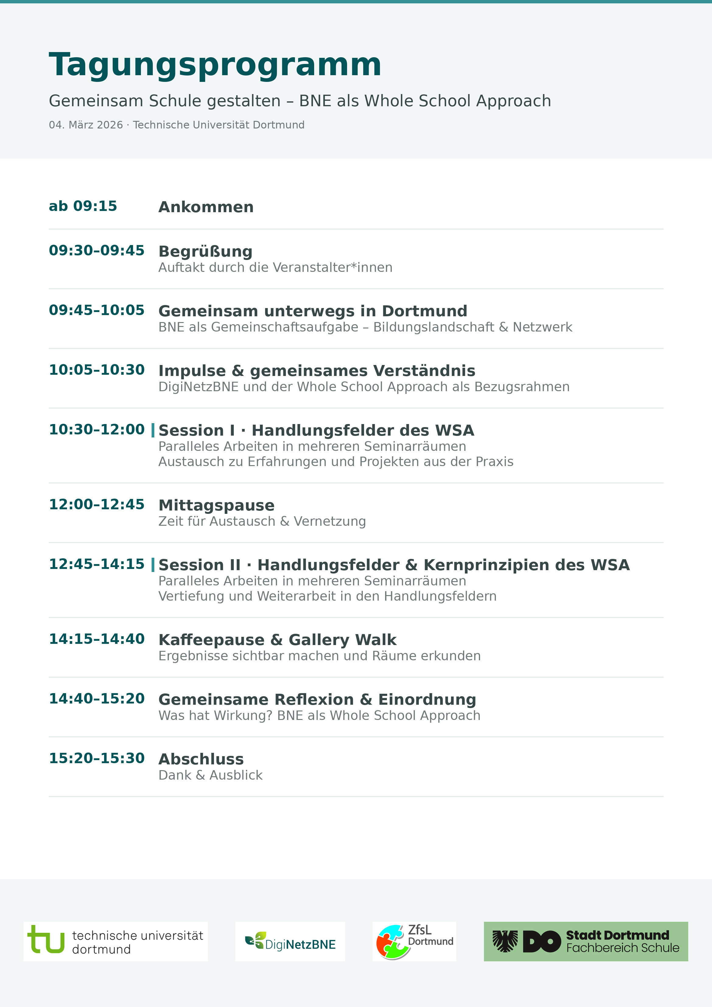 Gemeinsame Veranstalter sind das DigiNetzBNE-Projekt (TU Dortmund, FK 12), das Regionale Bildungsbüro Dortmund (Fachbereich Schule) und das ZfsL Dortmund.